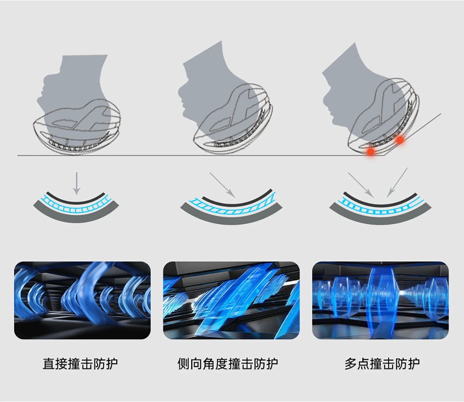 This system uses a 3D-GRlD©,a "dense soft supporting body" that mitigates collisionimpact energy from points to surfaces in all dimensions. Compared to traditional tech.nologies that convert impact energy indirectly and to a limited extent, the 3D-GRlD is adevice that buffers energy directly and from multiple angles.